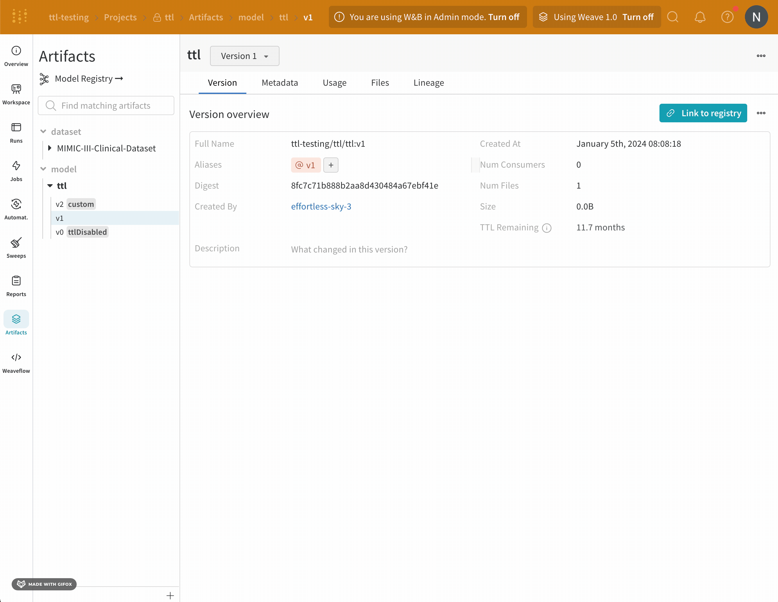 View TTL policies for artifacts with the Python SDK or with the W&B App UI.