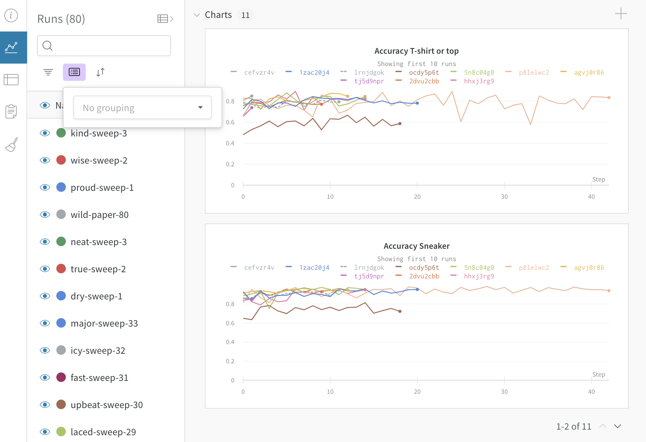 任意の列でrunをグループ化できます。例えばハイパーパラメータによってグループ化することができます。以下はその例です: