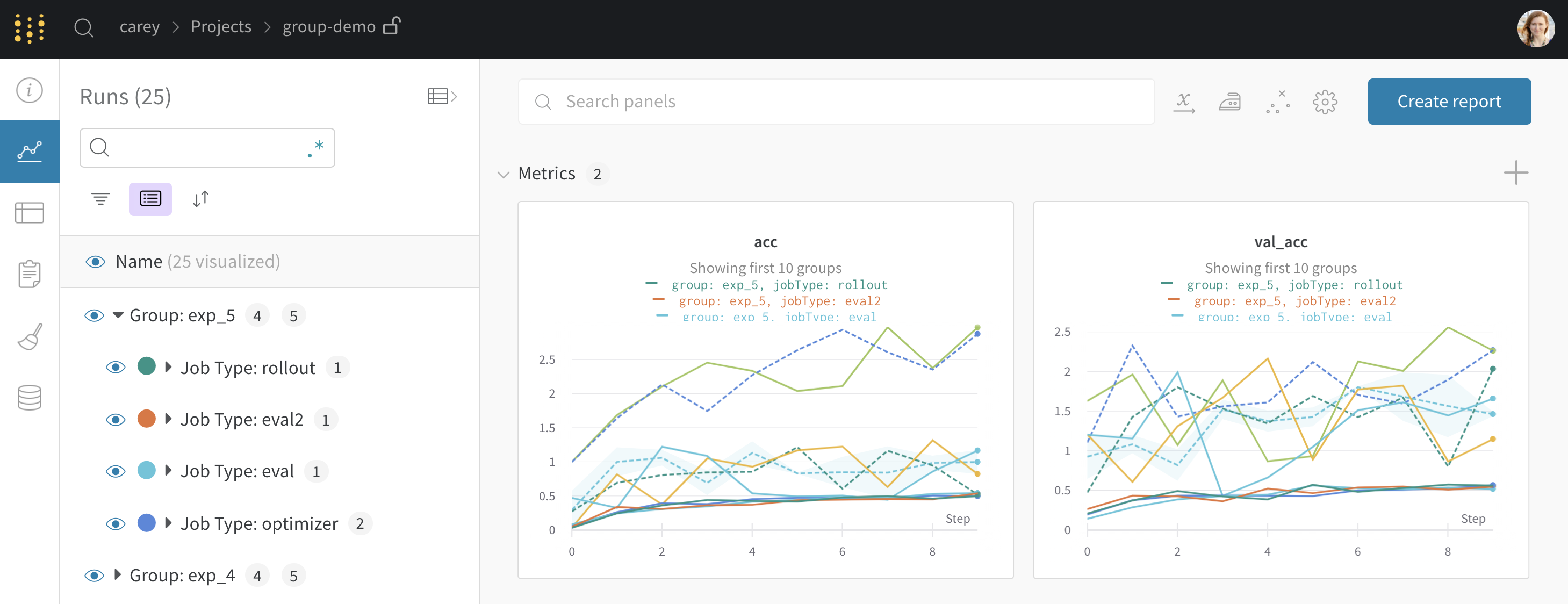 オプションのgroupとjob_typeをwandb.init()に渡します。これにより、個々のrunを含む各実験専用のグループページが作成されます。例えば: wandb.init(group="experiment_1", job_type="eval")