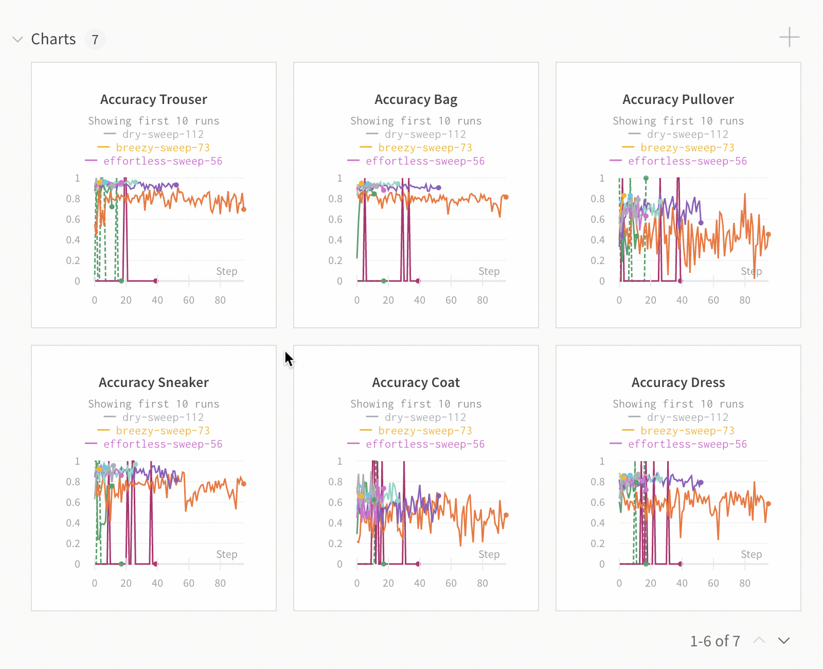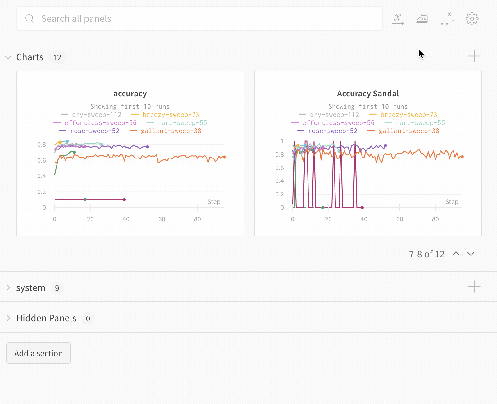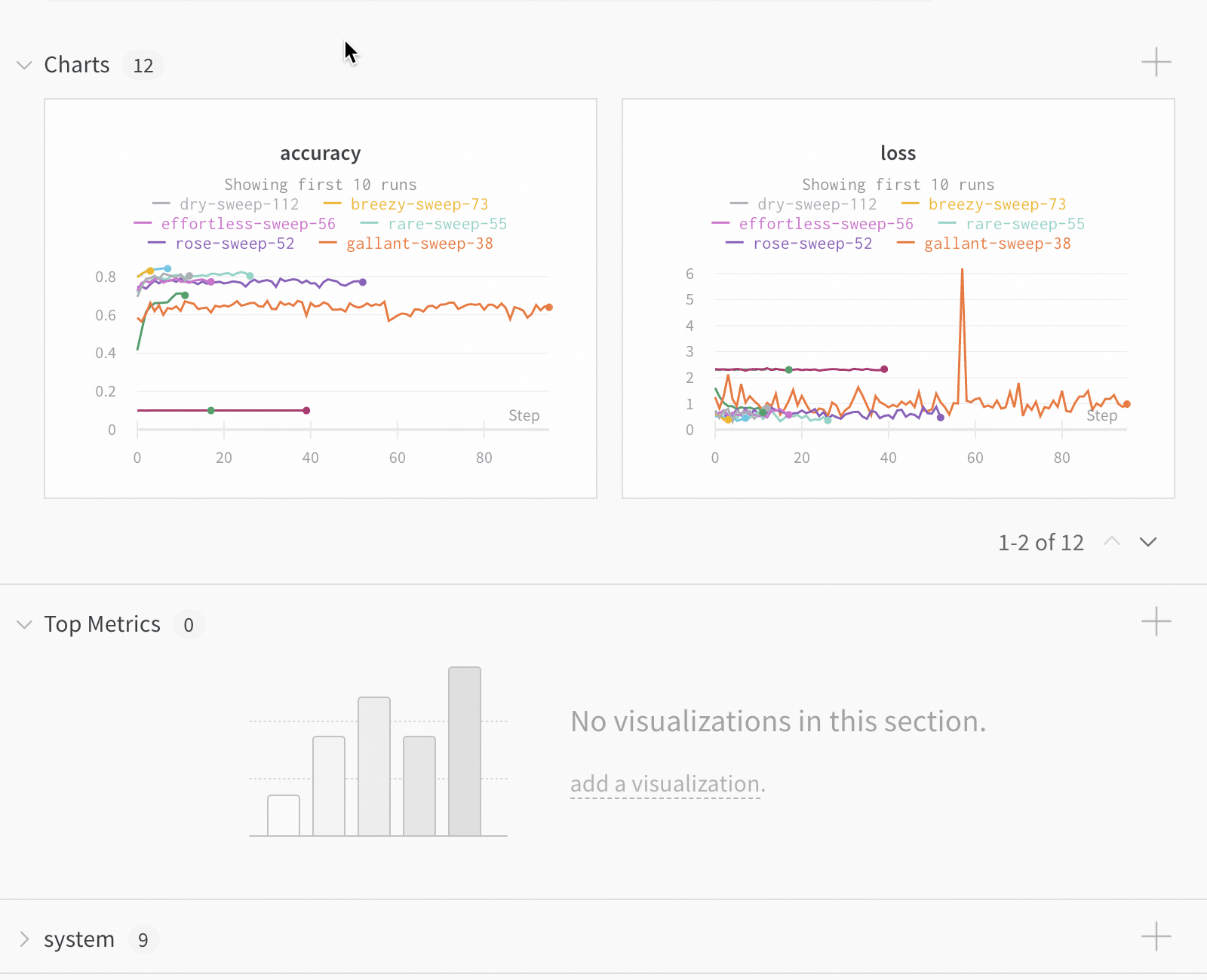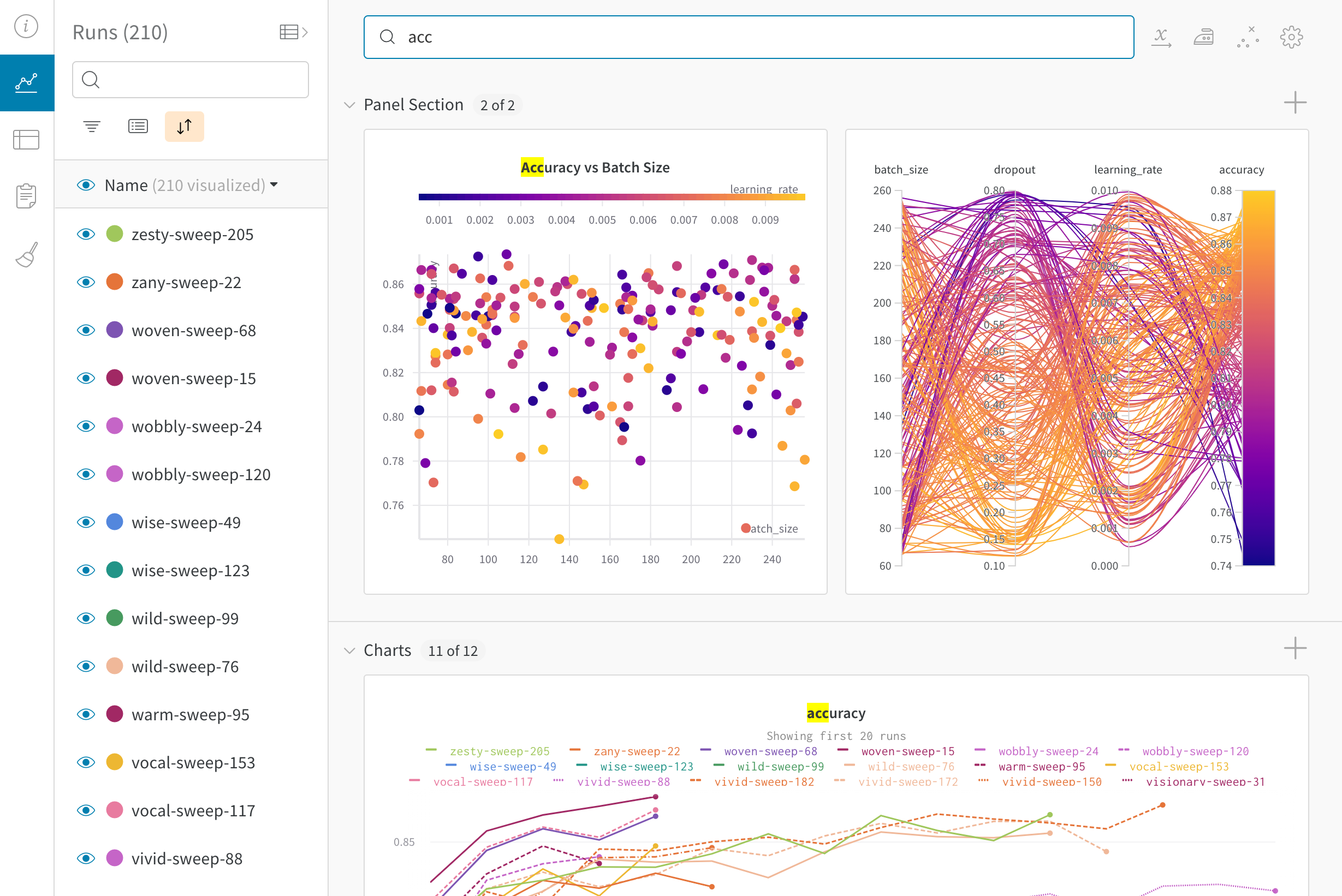 - 정렬: 예를 들어 가장 낮은 손실이나 가장 높은 정확도를 가진 run에 의해 run을 정렬할 값을 선택하세요. 정렬은 그래프에 나타나는 run에 영향을 미칩니다.