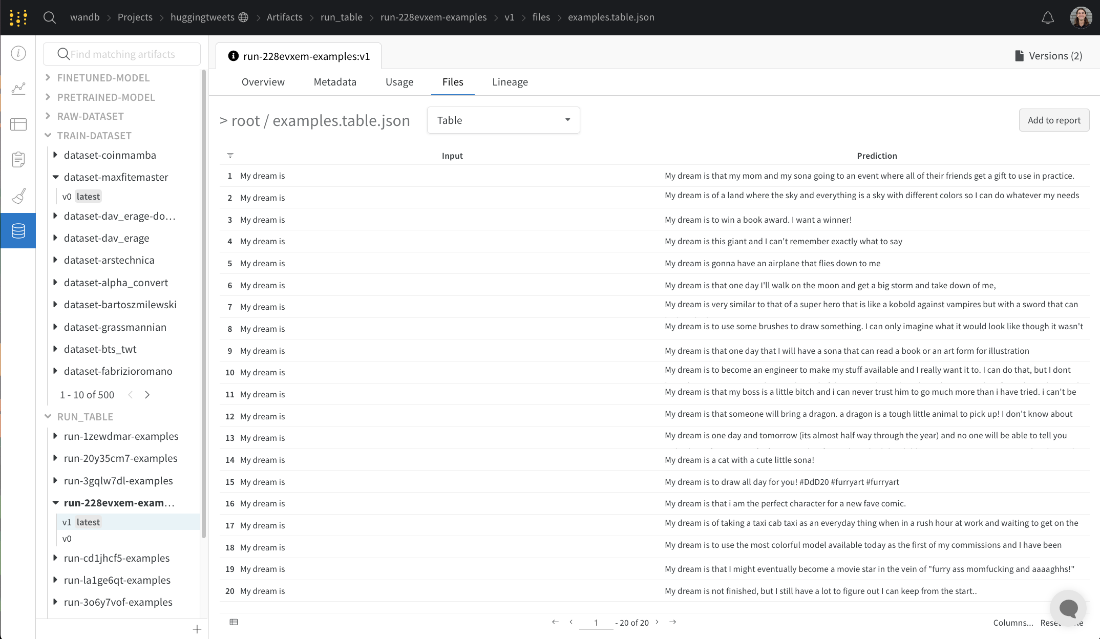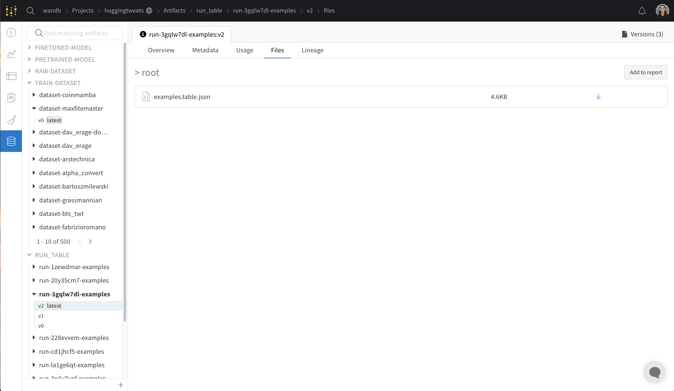 트레이닝 데이터셋과 파인튜닝된 모델부터 메트릭 및 미디어의 테이블에 이르기까지 프로젝트와 관련된 모든 아티팩트을 보세요.