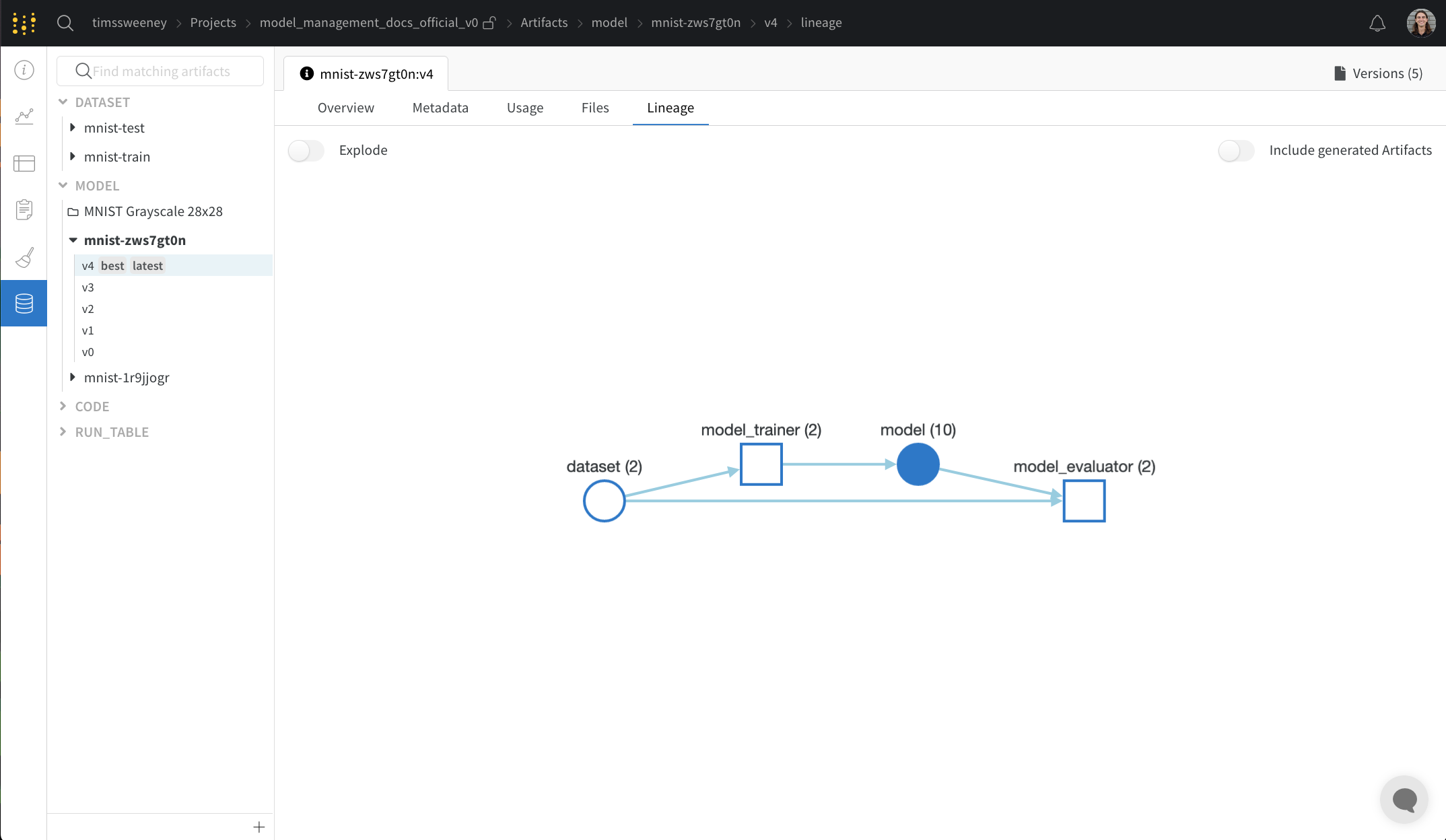 웹 앱 외부에서, 예를 들어 로컬 기계에서 아티팩트를 사용하기 위해 다운로드하는 코드 조각이 제공되는 사용 패널입니다. 이 섹션에서는 또한 아티팩트를 출력한 run과 아티팩트를 입력으로 사용하는 모든 run을 나타내고 링크합니다.