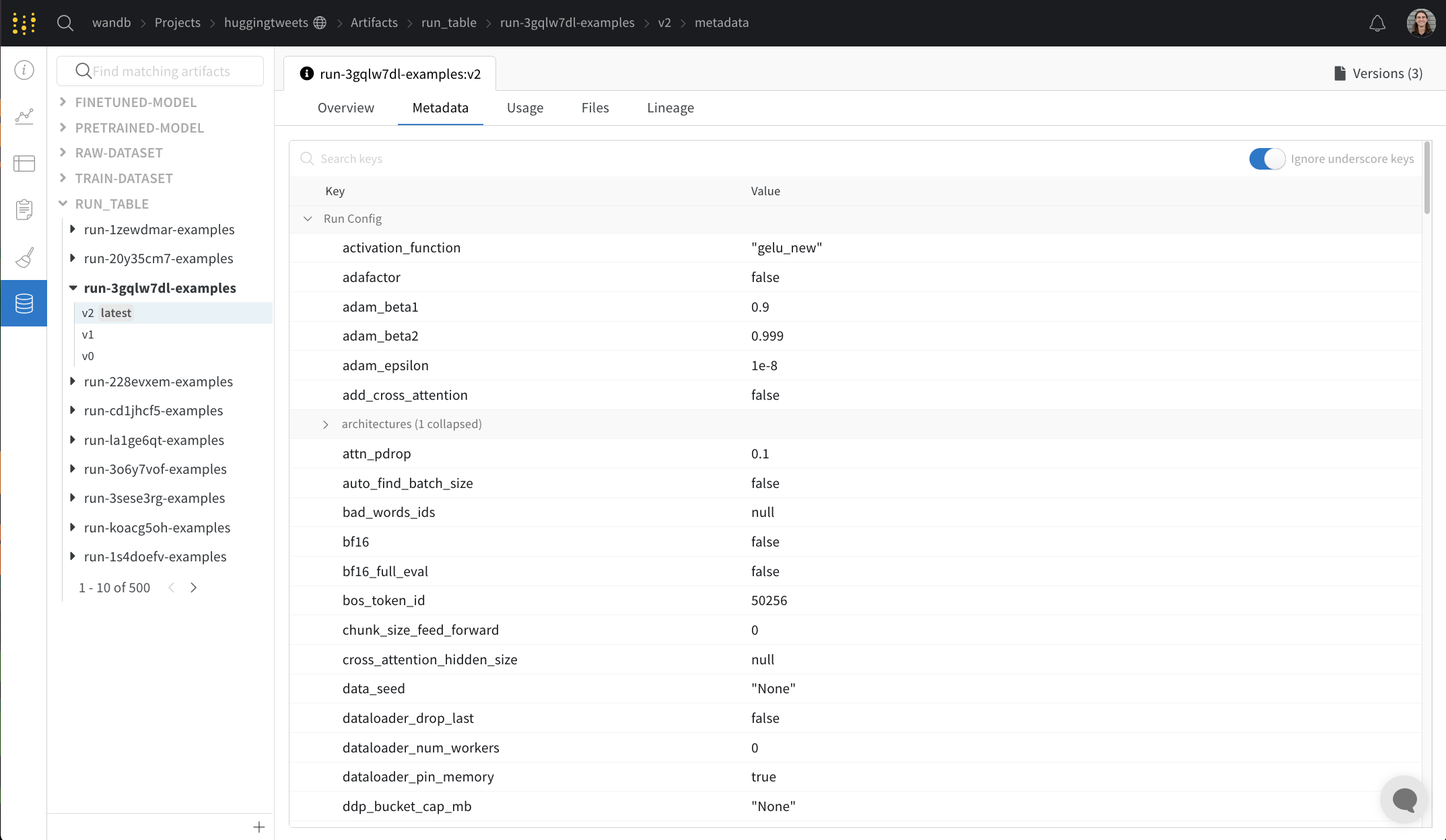 메타데이터 패널은 아티팩트가 구성될 때 제공된 아티팩트의 메타데이터에 액세스를 제공합니다. 이 메타데이터에는 아티팩트를 재구성하는 데 필요한 설정 인수, 추가 정보를 찾을 수 있는 URL 또는 아티팩트를 기록한 run 동안 생성된 메트릭이 포함될 수 있습니다. 추가로, 아티팩트를 생성한 run의 설정 및 아티팩트 기록 시점의 이력 메트릭을 볼 수 있습니다.