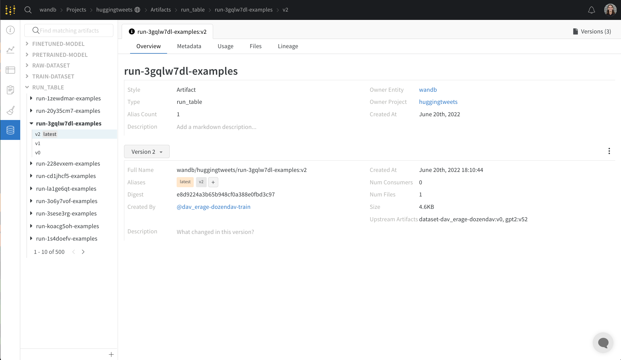 개요 패널에서는 아티팩트의 이름과 버전, 변경 사항 감지 및 중복 방지를 위해 사용되는 해시 다이제스트, 생성 날짜, 모든 에일리어스를 포함한 다양한 고급 정보를 찾을 수 있습니다. 여기에서 에일리어스를 추가하거나 제거하고, 버전뿐만 아니라 아티팩트 전체에 대해 노트를 작성할 수 있습니다.
