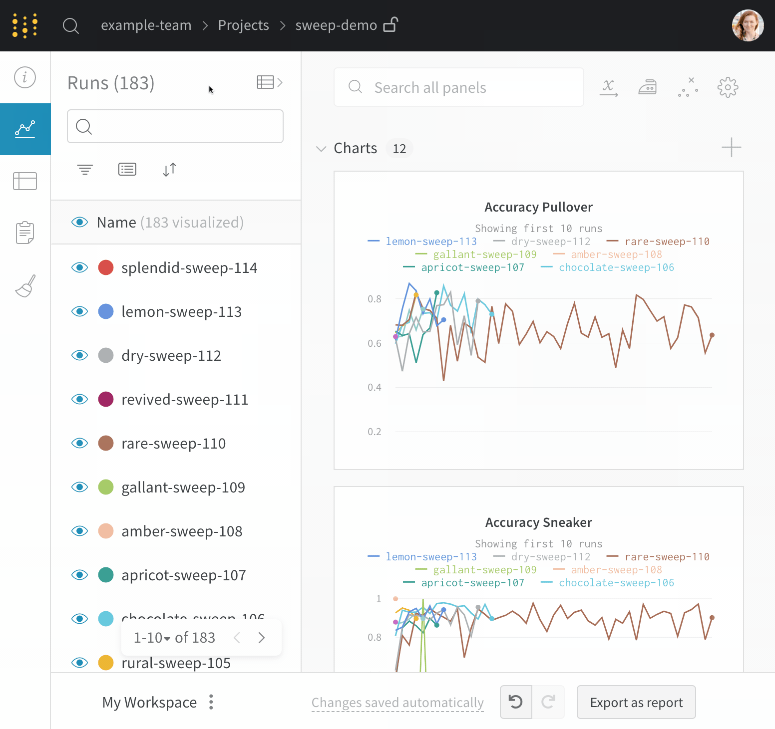- Run 수: 괄호 안의 숫자는 프로젝트의 총 run 수입니다. 숫자 (N 시각화됨)는 눈이 켜져 있고 각 그래프에서 시각화할 수 있는 run의 수입니다. 아래 예에서, 그래프는 183 run 중 처음 10개만 보여줍니다. 그래프에서 보이는 run의 최대 수를 늘리려면 그래프를 편집하세요.